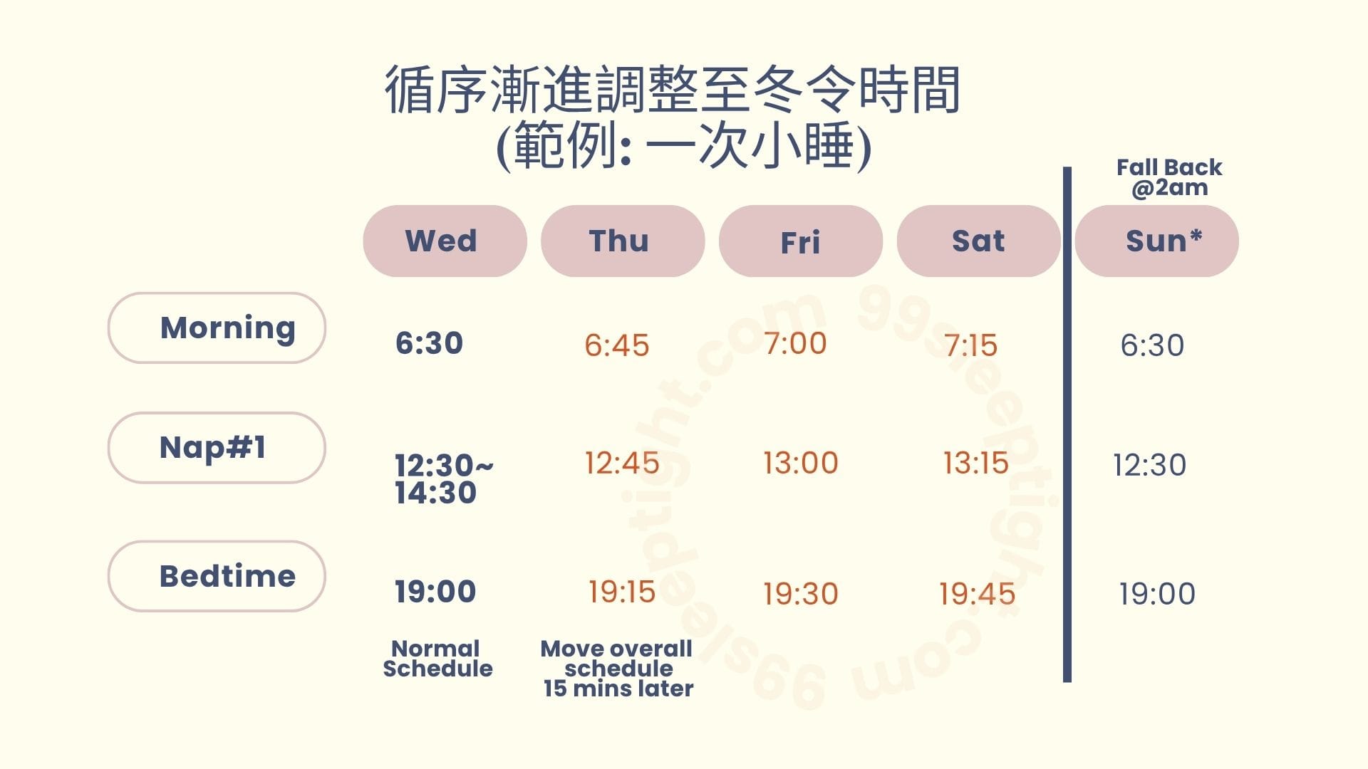 - 同步調整全天作息:除了夜晚睡眠,連同用餐、小睡、洗澡等日常活動,也都每天延後 15 分鐘,幫助孩子的生理時鐘逐步調整。
